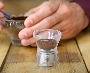 Using freshly ground coffee, fill the capsule and tamper.